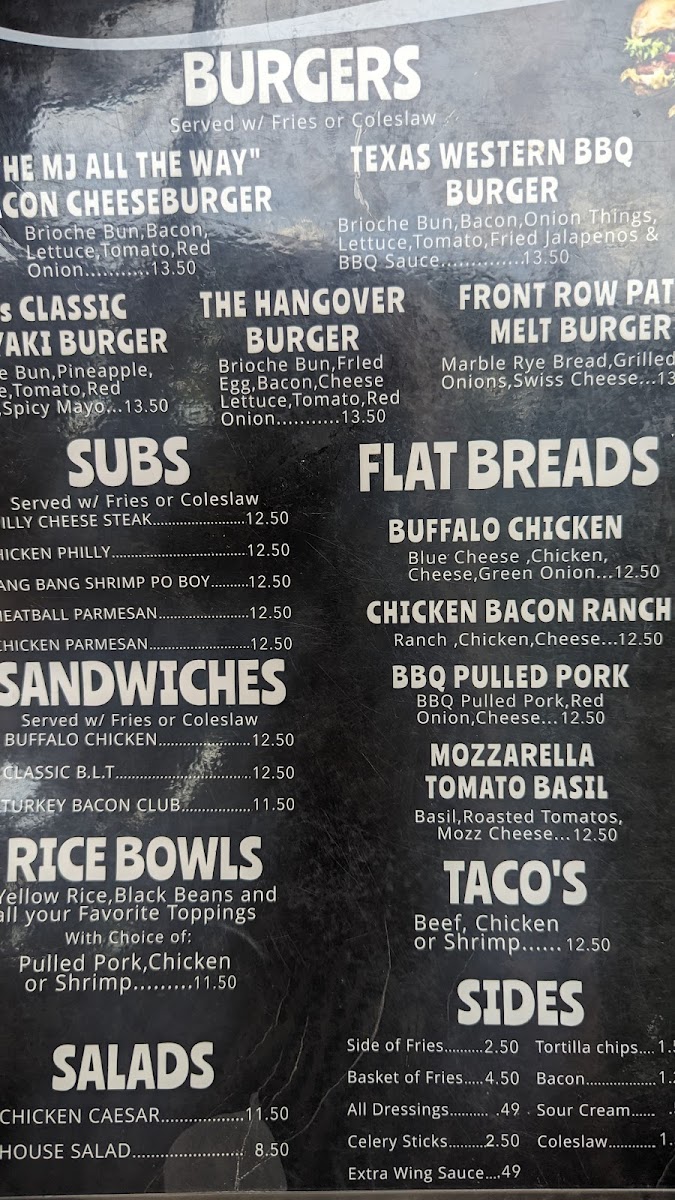 “ Love it at the front row, new in town just moved here. They treat us very nice. They got great prices, especially on their food specials. And one of the bartenders is really cool. Dude named cody, takes care of us has 2 dogs, a really nice guy. Come on this way ”